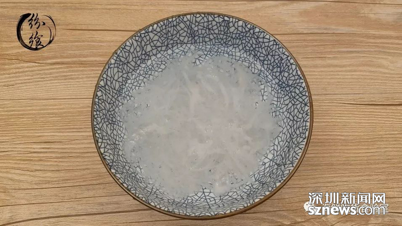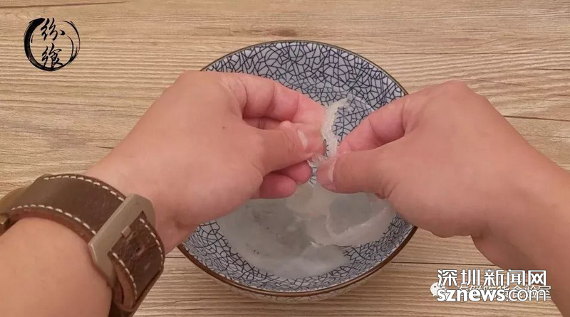 經(jīng)過(guò)3~5小時(shí)的浸泡后,燕窩已經(jīng)完全泡開(kāi)。此時(shí)用一把小鑷子,將泡發(fā)出的細(xì)碎的燕毛等雜質(zhì)挑出來(lái),清洗干凈泡開(kāi)的燕窩。