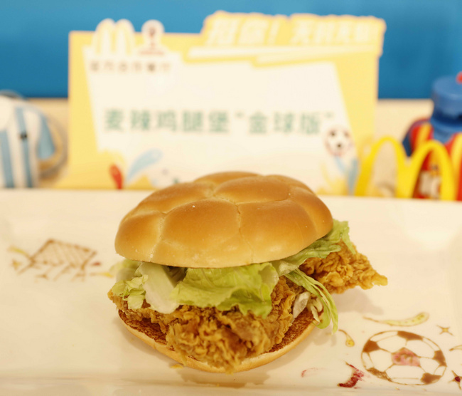 麥當(dāng)勞中國最受歡迎的漢堡單品——麥辣雞腿漢堡,在FIFA世界杯期間搖身一變“金球版”,蓋上足球形狀堡頂,F(xiàn)IFA世界杯期間10元限時特價