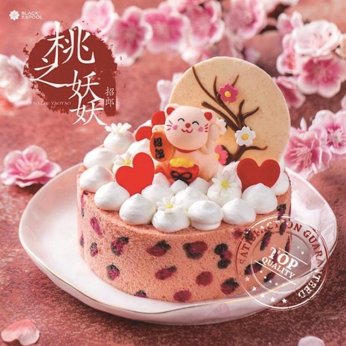 據(jù)黑池產(chǎn)品經(jīng)理介紹,“招郎蛋糕”是黑池最近重磅推出的新產(chǎn)品。蛋糕周圍覆盆子果干點綴而成的粉色豹紋,讓整個蛋糕充滿了野性魅惑又不失少女甜美。最為吸引眼球的,則是蛋糕表面,被桃花簇擁著的一只“招郎喵”。這只軟萌可愛的“招郎喵”,象征著,對得到這款蛋糕的人,最美好的祝愿,希望他們能夠遇到最好的愛情,找到心目中的那個他。