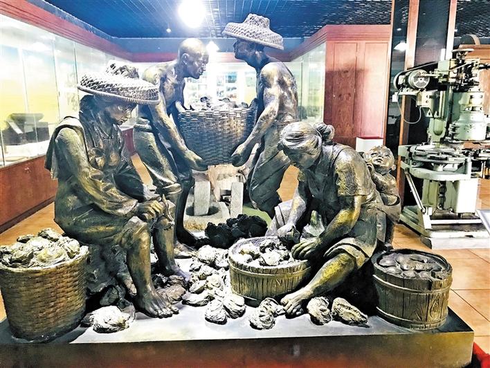 “茫茫大海接藍(lán)天,水下盡是養(yǎng)蠔田。阡陌田疇何界示,叔伯遙指高山巔?!辈┪镳^里這首關(guān)于“打山口”的詩(shī)歌深深吸引了記者。在長(zhǎng)期的發(fā)展過(guò)程中,沙井蠔業(yè)逐步形成了打山口、流水定作息、集體協(xié)作等生產(chǎn)習(xí)俗和蠔殼砌墻、上香禮拜天后等生活習(xí)俗,有一整套成熟的養(yǎng)殖和加工技術(shù),形成了種蠔、挒蠔、搬蠔、撒蠔、屯蠔、撲蠔、撿蠔、開(kāi)蠔等傳統(tǒng)工序。沙井蠔民生產(chǎn)習(xí)俗,世代相傳至今,具有一定的文化價(jià)值和社會(huì)價(jià)值,現(xiàn)已被列入深圳市非物質(zhì)文化遺產(chǎn)名錄。