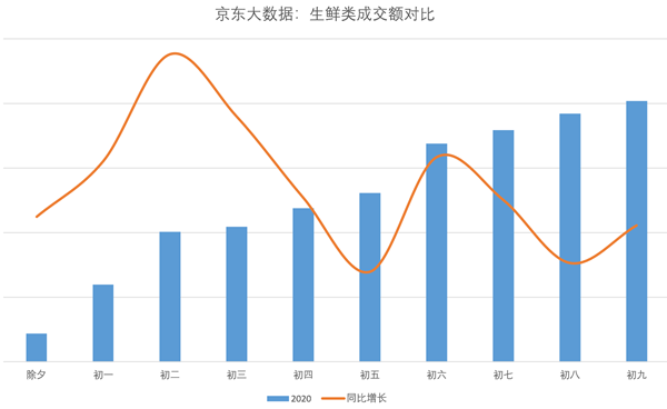 今年春節(jié),線上生鮮品類的需求量大幅增長。京東大數(shù)據(jù)顯示,整個春節(jié)期間,京東生鮮成交額同比增長215%,為消費者提供了近1.5萬噸生鮮產(chǎn)品,蔬菜成交額同比增長近450%。在京東到家平臺上,除夕至大年初九,糧油副食商品銷售額同比去年春節(jié)增長736.40%,肉品同比增長711.11%,休閑食品增長527.16%,蔬菜增長441.1%,水果增長378.8%,米面糧油、肉禽蛋奶、蔬菜水果和水餃餛飩等速凍食品均十分暢銷。