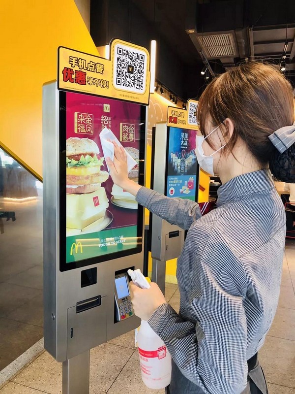 目前全國(guó)所有的麥當(dāng)勞餐廳啟動(dòng)上班員工測(cè)溫流程,并提高員工洗手消毒頻次,全國(guó)餐廳全員佩戴口罩。在餐廳為顧客提供免洗洗手液,對(duì)所有餐廳的通風(fēng)系統(tǒng)和顧客常接觸的設(shè)施,強(qiáng)化消毒并增加頻次,包括大門把手、自助點(diǎn)餐屏、樓梯扶手、柜臺(tái)臺(tái)面、取餐區(qū)、桌椅、餐盤、兒童椅、兒童樂(lè)園等。