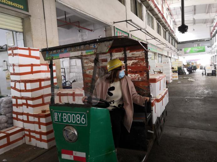 市場的檔主、物流車司機(jī)、加工工人,全部都帶上口罩,看新聞講跟人講話要保持距離,但忙起來真顧不了那么多,大家都在“搶貨”,這頭跟檔主商量好,那頭貨可能被拉走了?!柏浺阶约旱募庸ぶ行模潘闶悄愕?。”因?yàn)榇汗?jié)批發(fā)市場的檔口工人回去一大半了,沒人送貨,緊張的時(shí)候,有女同事干脆自己借一輛三輪車,把談好的貨源直接拉走。