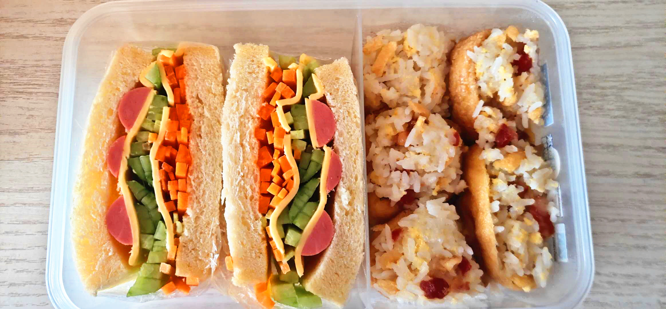 胡蘿卜和青瓜切絲,臘腸切成粒火腿腸對半切,準備面包四片,芝士片四片。拿一張保鮮膜,將一片面包片放在上面,然后依次擺上胡蘿卜、芝士片、青瓜片和火腿腸片,再放上一片面包片,用保鮮膜包起來。包緊,然后從中間切成兩半,裝在飯盒里即可。將臘腸粒放在剩飯里,加鹽和醬油一起拌均后,再放進掏空的豆腐泡里。整個豆腐泡隔水蒸大約十分鐘左右,再裝在飯盒就可以了。