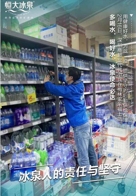 抗擊疫情不停止,恒大冰泉除了捐贈(zèng)物資提供愛心水,為了確保當(dāng)?shù)仫嬘盟淖泐~供應(yīng),一批批恒大冰泉也在各大商場(chǎng)大量上架。