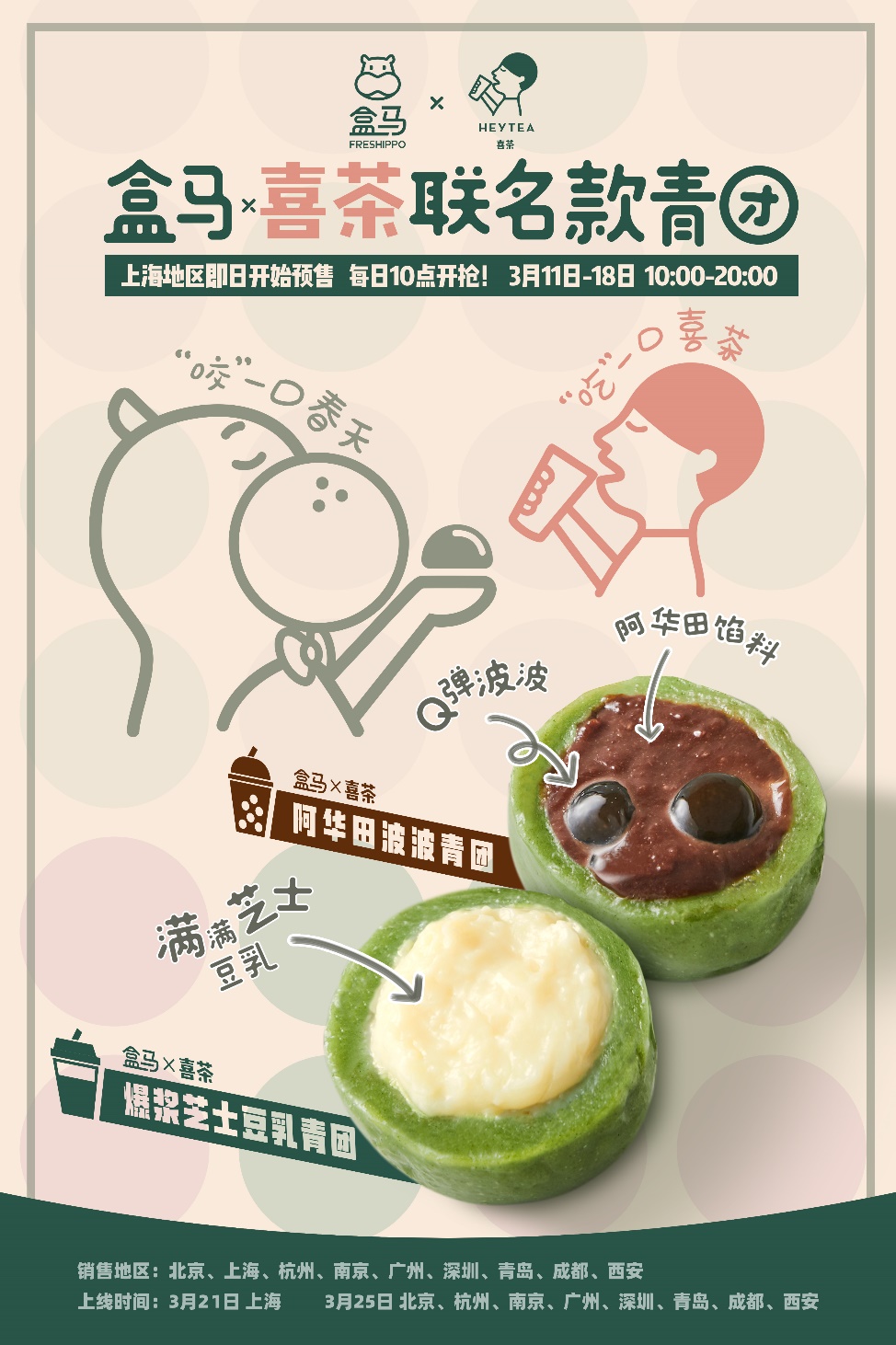 據(jù)了解,盒馬×喜茶聯(lián)名青團(tuán)于3月11日開啟上海地區(qū)的預(yù)售,3月21日將正式上線。北京、杭州、南京、廣州、深圳、青島、成都、西安等地將于3月25日上線,屆時(shí)消費(fèi)者可通過(guò)盒馬線上下單,30分鐘就能吃上春天的味道。