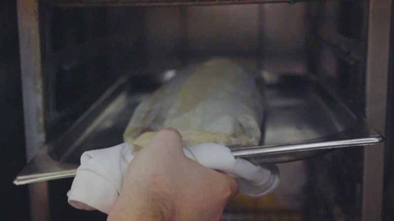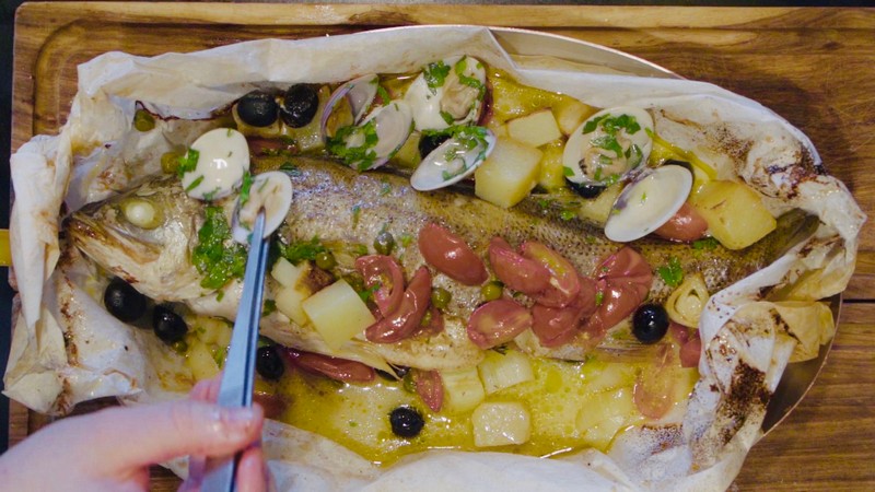 清蒸鱸魚是常見(jiàn)的粵式吃法,本期,四季酒店主廚畢柏克為吃貨們帶來(lái)別樣的鱸魚吃法——“烤紙包鱸魚”。他將魚進(jìn)行腌制后,用烘焙用紙裹緊,在烤爐中烤制40分鐘。吸收了海鮮文蛤、白葡萄酒精華的魚肉緊實(shí)鮮嫩,在打開外包紙的那一刻,香氣四溢,讓人欲罷不能。如此烹法,也能最大限度保存魚的營(yíng)養(yǎng)和鮮美。
