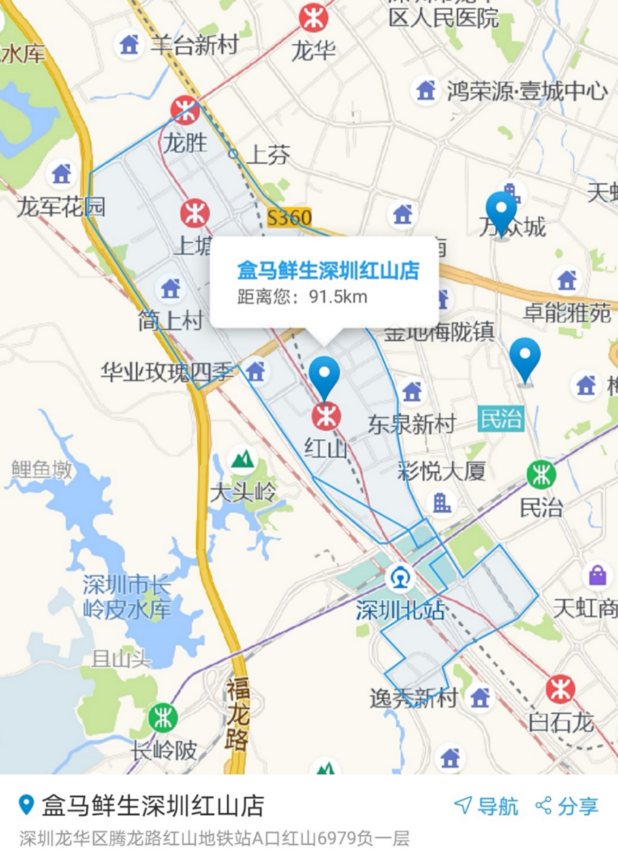 近年來,隨著深圳發(fā)展重心北拓、深圳特區(qū)一體化進程加快,即便是在傳統(tǒng)意義上的深圳關外,在盒馬紅山店的配送范圍內,已經(jīng)有一家沃爾瑪、兩家華潤萬家等大賣場,還有十幾家錢大媽和一個農(nóng)貿(mào)批發(fā)市場,各類線下零售和社區(qū)買菜業(yè)態(tài)也在該區(qū)域快速發(fā)展。