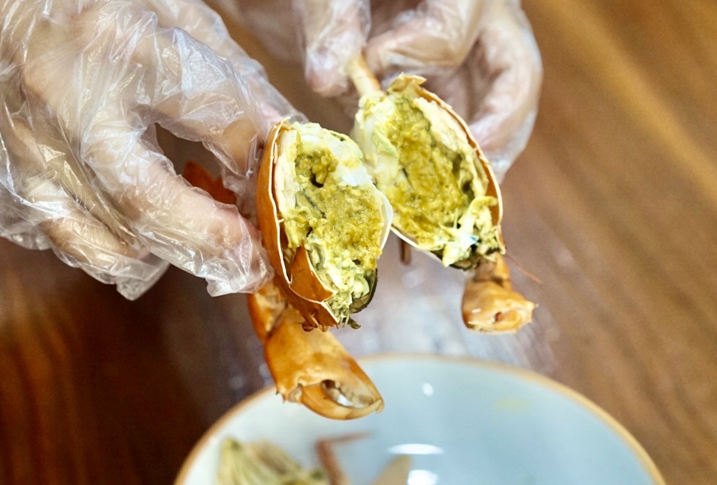 番禺美食家屈九先生說,石樓鎮(zhèn)的咸淡水交界區(qū)域是產蟹佳地。他曾說,如果有幸遇上換殼期的重皮奄仔蟹則更佳,硬殼底下有一層新生的軟殼,蟹膏濃滑似流沙蛋黃,非常滋味。成隆行廣州區(qū)域負責人楊先生則說,深圳本地奄仔蟹量有限,以精養(yǎng)為主。