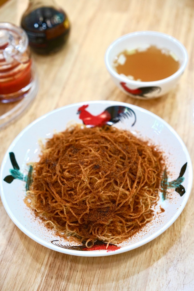他家的云吞面同樣投注了許多的心機(jī)。湯底用厚身的油地、淡水蝦子、蝦米、金華火腿和豬骨來(lái)熬制,每天早上3點(diǎn)半開(kāi)始煲,足足煲上3個(gè)小時(shí)。他認(rèn)為如今的雞蛋香味并不遜色于鴨蛋,因此在做面時(shí),他用的是雞蛋,蛋清與蛋黃都用上。蛋清增加面的硬度,蛋黃帶來(lái)香度。面條同樣用高筋面,面所用的堿水,是有著上百年歷史的陳村食用堿水,爽中帶麥香,這是嚴(yán)格把控走堿時(shí)間的“成果”。至于云吞,吳錦云有自己的理解,不加鮮蝦,只用豬的上胛肉。手工處理,挑除上胛肉的筋與網(wǎng)油,最后的成率只有六七成。豬肉全部經(jīng)過(guò)手工切,一粒粒肥瘦均勻。薄薄的云吞皮,裹著精制過(guò)的豬肉,小巧玲瓏,肉香皮薄。