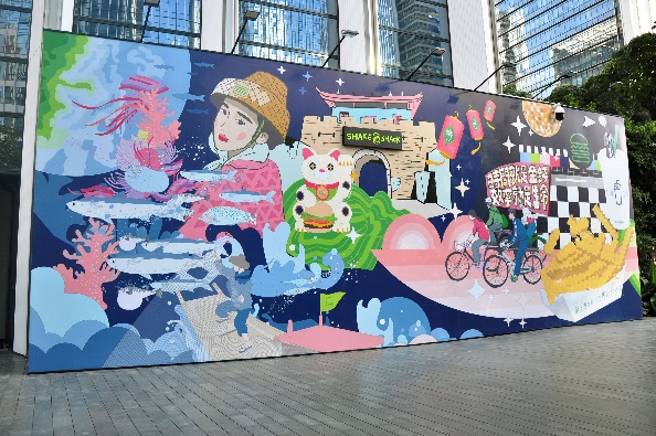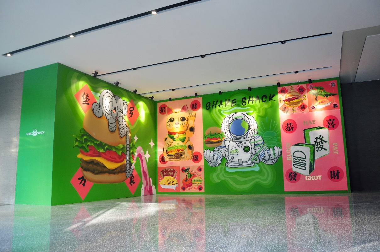 圍擋的室內(nèi)部分采用創(chuàng)新的互動(dòng)形式,由藝術(shù)家現(xiàn)場(chǎng)親自手繪完成的8幅單元涂鴉畫(huà)板組合而成。藝術(shù)家用摩登時(shí)尚的波譜藝術(shù),向當(dāng)?shù)刭e客們奉送出中國(guó)傳統(tǒng)的祝福及Shake Shack的活力熱情。