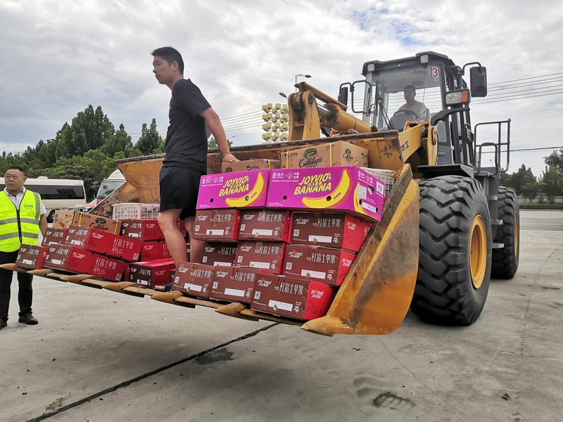 鏟車接力運送賑災(zāi)愛心水果。