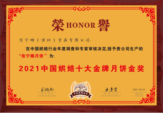 經(jīng)過多年的發(fā)展與沉淀,佳寧娜月餅以先進(jìn)的工藝、獨(dú)特的口味、卓越的信譽(yù)贏得消費(fèi)者的信賴和支持,曾榮獲“深圳老字號”“深圳月餅節(jié)質(zhì)量信譽(yù)獎” (連續(xù)12年 )“中國食品安全年會食品安全示范單位”“中國烘焙五仁月餅金獎”“中國烘焙廣式月餅金獎”“中國烘焙潮式月餅金獎”、“中國烘焙十佳名牌月餅”、“中國烘焙老字號月餅“等多項(xiàng)榮譽(yù)稱號。