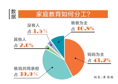 此次調(diào)查中,用14個(gè)指標(biāo)考察家庭教育分工情況,包括:輔導(dǎo)孩子學(xué)習(xí)、培養(yǎng)孩子特長、接送孩子上下學(xué)、開家長會(huì)、培養(yǎng)孩子日常行為習(xí)慣、糾正孩子的不良行為、教孩子明辨是非、照顧孩子的飲食起居、和孩子一起游戲及和孩子聊天。統(tǒng)計(jì)數(shù)據(jù)顯示,家庭教育分工中,“媽媽為主”的家庭占43.2%,“爸爸為主”占10.8%,“爸媽共同承擔(dān)”占39.9%,“其他人做”占2.6%,“沒有人做”占3.5%。