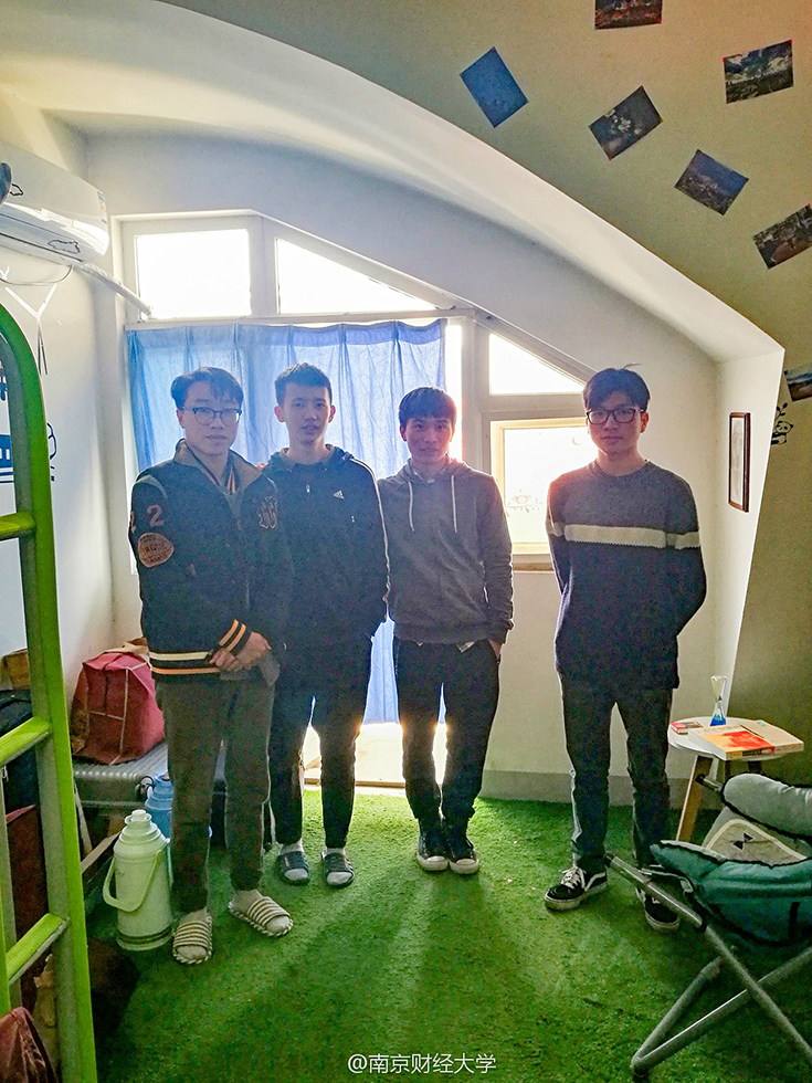 綿綿的草坪、充滿設(shè)計(jì)感的書(shū)架、掛著素描畫(huà)的墻……難以想象這是四個(gè)19歲男生的寢室。南京財(cái)經(jīng)大學(xué)西苑9幢男生宿舍頂樓602寢室,住著4位“世外高人”—— 涂貴平、柯毅、劉以康和廉鎮(zhèn)宇,他們用事實(shí)告訴大家,男生宿舍文藝起來(lái),可絲毫不輸女生。