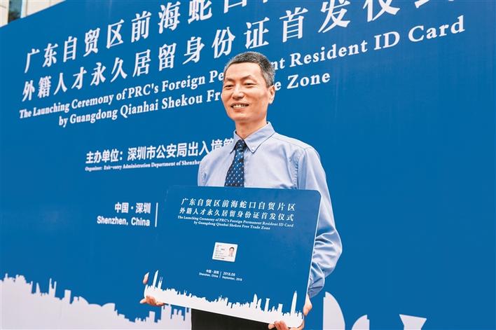 9月4日,深圳市公安局舉行廣東自貿(mào)區(qū)前海蛇口自貿(mào)片區(qū)外籍人才永久居留身份證首發(fā)儀式,澳大利亞籍華人張威獲發(fā)首張證件,為廣東省首位積分評定的技術(shù)人才申請獲得廣東自貿(mào)區(qū)外籍人才永久居留身份證。