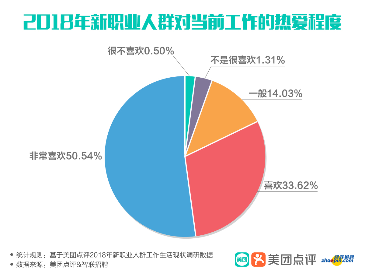 入職原因數(shù)據(jù)充分佐證了這一結(jié)論。報告發(fā)現(xiàn),“喜歡這個行業(yè)和職業(yè)”,這是新職業(yè)人群最普遍的入職原因。73.67%的新職業(yè)人群,是因?yàn)閮?nèi)心喜歡而選擇這份工作。談及對當(dāng)前工作的熱愛程度,50.54%的人對工作表示“非常喜歡”,對工作表示“喜歡”的有33.62%;對當(dāng)前工作表示不喜歡的,占比僅有1.81%。