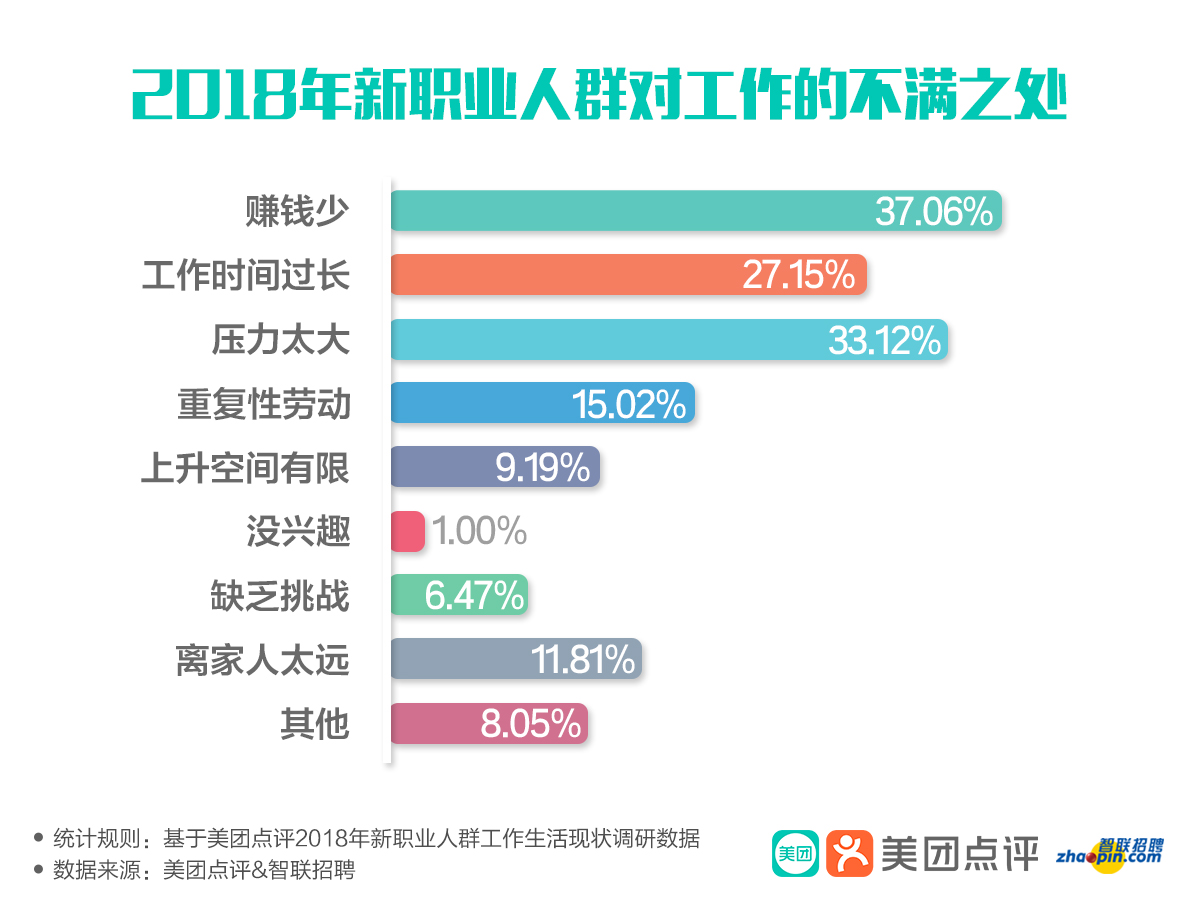 盡管新職業(yè)人群因?yàn)椤跋矚g這個行業(yè)和職業(yè)”而加入,但對更高薪資待遇的追求,與白領(lǐng)是一致的。談及對工作的不滿之處,盡管他們對工作有一些抱怨,在此項(xiàng)調(diào)研上有多重表達(dá),但最大的不滿還是直指薪酬水平。報告發(fā)現(xiàn),被新職業(yè)人群認(rèn)為對工作不滿的前三大原因是:賺錢少、壓力太大、工作時間太長。