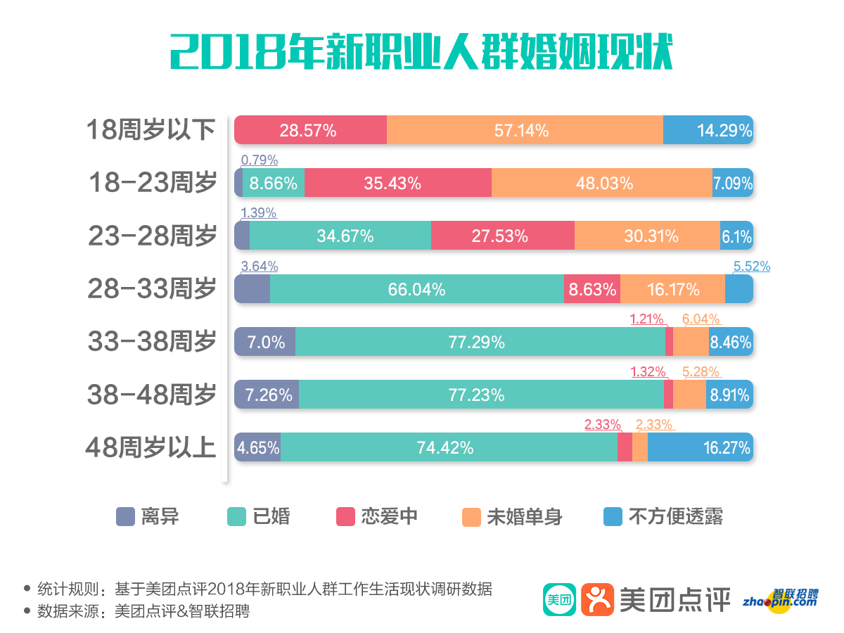 據(jù)《人民日報》報道,近30年來,年輕人晚婚的現(xiàn)象越來越明顯。在新職業(yè)人群中,婚姻狀態(tài)也符合了這一社會趨勢。數(shù)據(jù)顯示,在新職業(yè)人群中,僅僅有34.67%的90后(23-28周歲)已經(jīng)結(jié)婚,85后(28-33周歲)的已婚率則達(dá)到了66.04%,到了80后(33-38周歲),已婚率提高到了77.29%,這個數(shù)據(jù)符合大眾的普遍認(rèn)知。