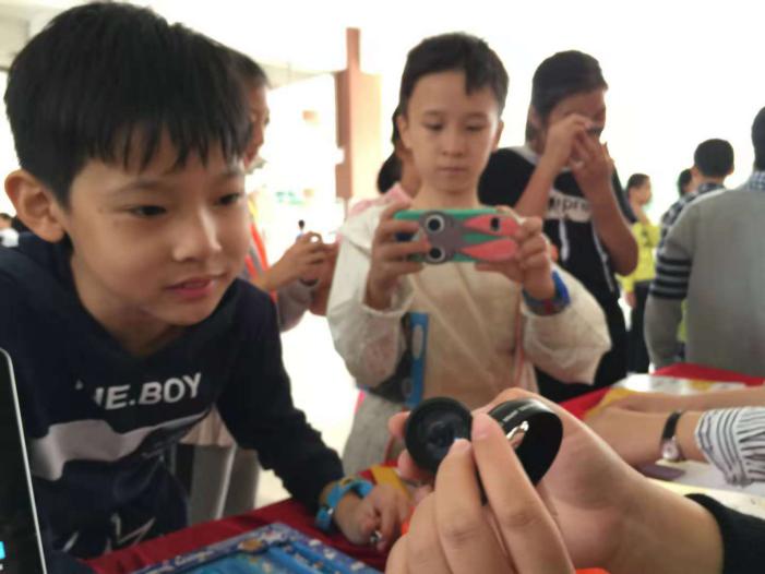 科普益智互動游戲精彩紛呈,深圳阿卡索資訊股份有限公司的華容道大闖關、筷子夾彈珠互動游戲極大激發(fā)了同學們的參與熱情。深圳市夢飛翔文化傳播有限公司及深圳諾必達節(jié)能環(huán)保有限公司的智能陪伴機器人能詩歌能朗誦,“通今博古”能答疑解惑,成為同學們的良師益友。各種技能培訓在其中兩家學校同步開展,包括中廣和(深圳)科技有限公司的兒童護理實用技能、深圳光影教育投資有限公司的手機和單反使用講座、深圳市海文深生物科技有限公司的牙膏制作工藝展示等項目,讓孩子們收獲不少生活技能。