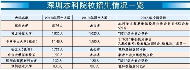 在目前已經公布今年招生計劃的深圳高校中,深圳技術大學于2017年、2018年分別依托深圳大學招收226名及807名全日制本科生;2018年11月30日,深圳技術大學獲教育部發(fā)函正式成立,于2019年進行首年獨立招生。記者從該校獲悉,深圳技術大學今年的招生數量與去年基本持平,計劃招收6個專業(yè)11個方向的800名新生。2019年,香港中文大學(深圳)預計在全國26個省市(自治區(qū))共招收本科生1200人,相比去年稍有增加。南科大也表示,今年計劃招收本科生1030人,與2018年的招生人數相差無幾。深圳北理莫斯科大學今年將啟用永久校區(qū),招生人數從去年的130人擴大到了180人。