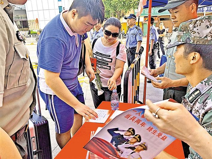 6月8日下午,征兵工作人員在龍華中學(xué)考點外開展了針對高考考生的征兵宣傳。
