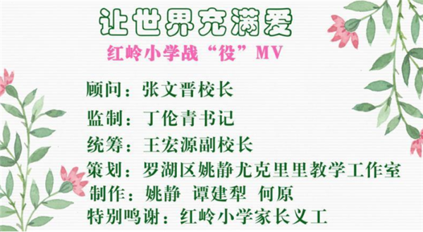 經(jīng)過學(xué)校老師、家長們的共同努力,3月23日,全長6分零6秒的紅嶺小學(xué)戰(zhàn)疫M(jìn)V《讓世界充滿愛》順利完成。該片通過紅嶺小學(xué)微信公眾號首發(fā),目前,已在深圳晚報、晶報、深圳新聞網(wǎng)等多家主流媒體平臺傳播。