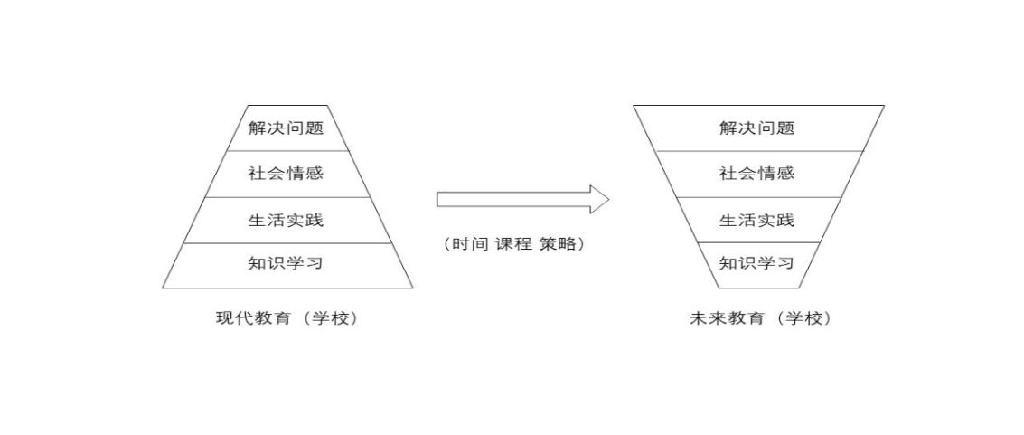 如果說未來教育要超越現(xiàn)代教育,必須把四個(gè)層次的權(quán)重倒置過來,如圖所示,即從時(shí)間、課程和策略上做根本性的認(rèn)識(shí)和改變。