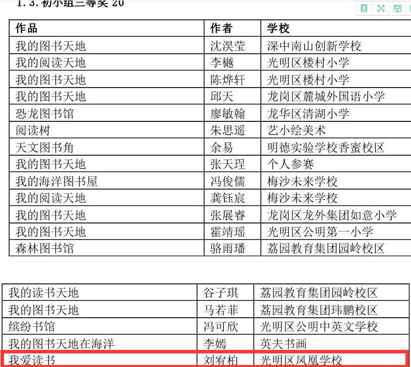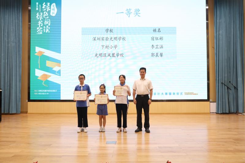 在光明區(qū)第五屆“綠色閱讀——綠書簽”設(shè)計大賽中,學(xué)校榮獲優(yōu)秀組織獎,郭晨曦同學(xué)獲一等獎,朱文睿、陳柳婉同學(xué)獲二等獎,陳欣妍同學(xué)獲優(yōu)秀獎。