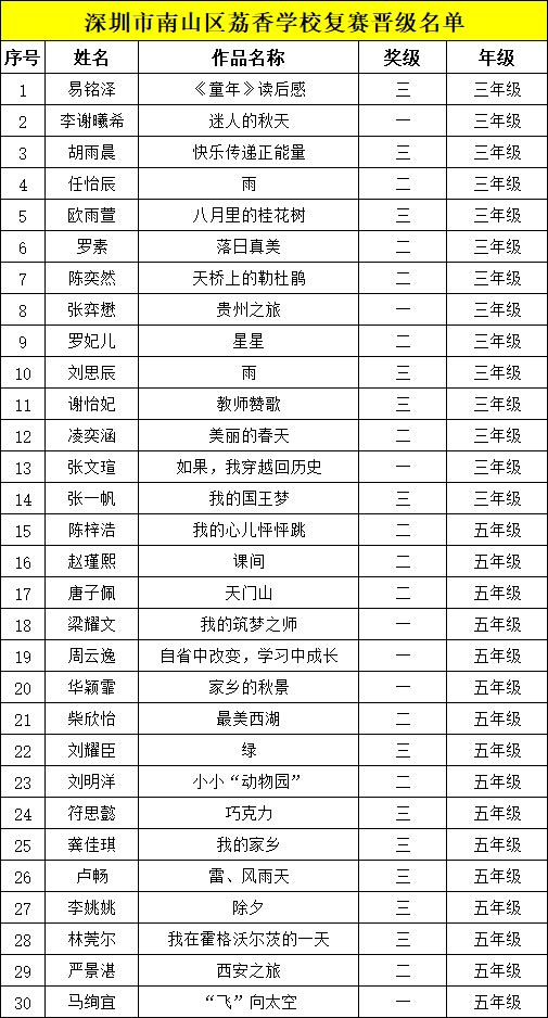 自2021年1月,活動征稿啟動以來,獲得了深圳市廣大中小學生、教師、文學愛好者的熱烈響應(yīng)積極參與,吸引了深圳百余所學校的上萬人關(guān)注報名?,F(xiàn)公布南山區(qū)荔香學校晉級復賽名單如下: