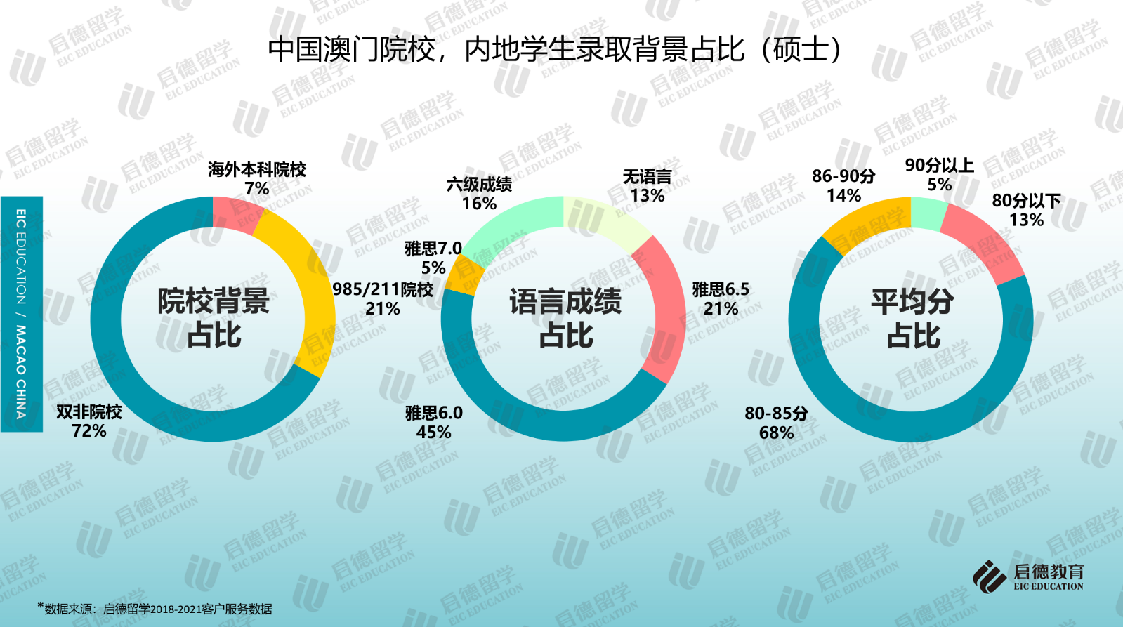 本科錄取中,澳門大學(xué)的要求較高,應(yīng)屆高考生申請人高考成績要達到一本線;碩士錄取中,只有澳門大學(xué)和澳門旅游學(xué)院要求碩士申請學(xué)生提交英語成績,雅思6分為澳門大學(xué)和澳門旅游學(xué)院的語言門檻要求,澳門大學(xué)碩士申請也可接受430分以上六級和TEM4/8成績;其它院校的大多數(shù)專業(yè)對英語成績無硬性要求。啟德留學(xué)2018-2021客戶服務(wù)數(shù)據(jù)顯示,2021年碩士錄取學(xué)生中,45%達到雅思6分的門檻成績,雅思成績6.5分以上達到26%,16%的學(xué)生只提供了合格的六級成績,13%為無語言錄?。黄叱梢陨系拇T士錄取學(xué)生來自雙非院校;GPA在80分以上的占比為87%。