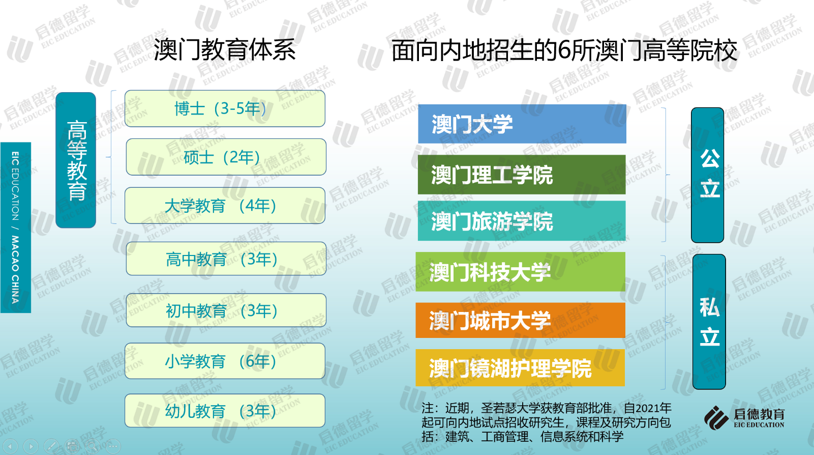 作為中西文化交匯的國際旅游城市,中國澳門的輕工業(yè)、旅游業(yè)、酒店業(yè)和娛樂場使其成為中外游客青睞的旅游度假勝地。澳門與香港同樣都具有獨特的地緣優(yōu)勢,既有中國文化的根基,又融會貫通了歐美教育的優(yōu)勢,中文、葡文、英文學(xué)制并存的多語言教學(xué)與多元文化交融的國際化環(huán)境,為學(xué)生提供了開闊的國際視野和學(xué)術(shù)氛圍,也為當?shù)馗叩冉逃陌l(fā)展創(chuàng)造了良好的條件。目前,澳門大學(xué)、澳門理工學(xué)院、澳門旅游學(xué)院、澳門城市大學(xué)、澳門鏡湖護理學(xué)院、澳門科技大學(xué)等6所高校獲教育部批準可面向內(nèi)地招收本科生及研究生,圣若瑟大學(xué)獲教育部批準自2021年起可面向內(nèi)地試點招收研究生。