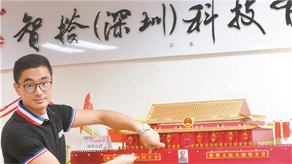 在8平方米的展臺(tái)上,1.2米寬、1米左右高的天安門(mén)雄壯威武,護(hù)旗手、閱兵戰(zhàn)士、坦克、裝甲車、吉普車、升旗臺(tái)等一應(yīng)俱全、栩栩如生