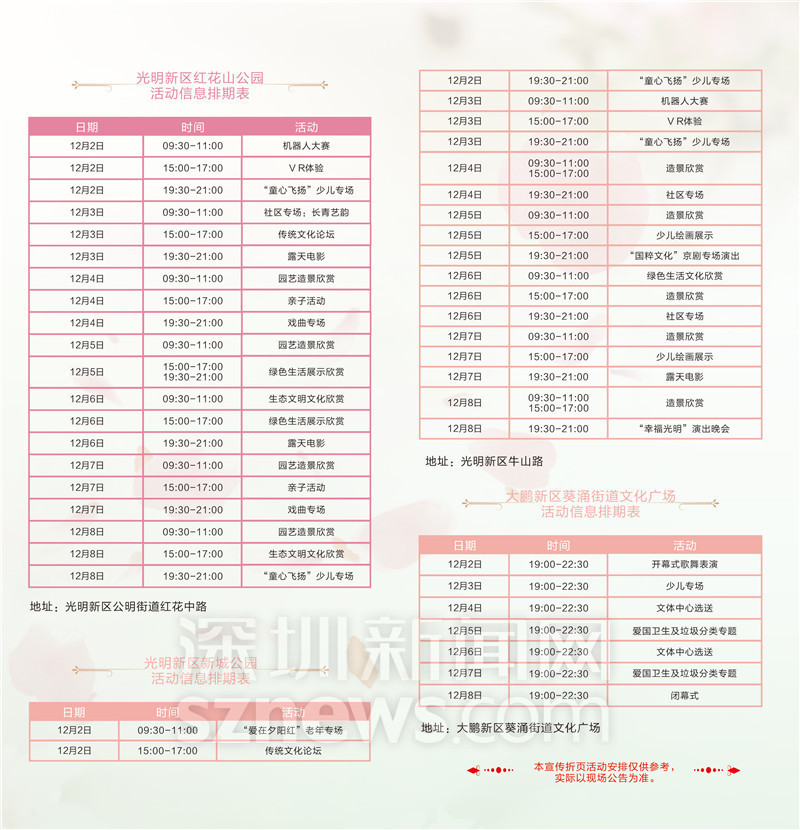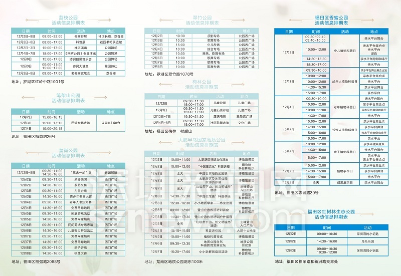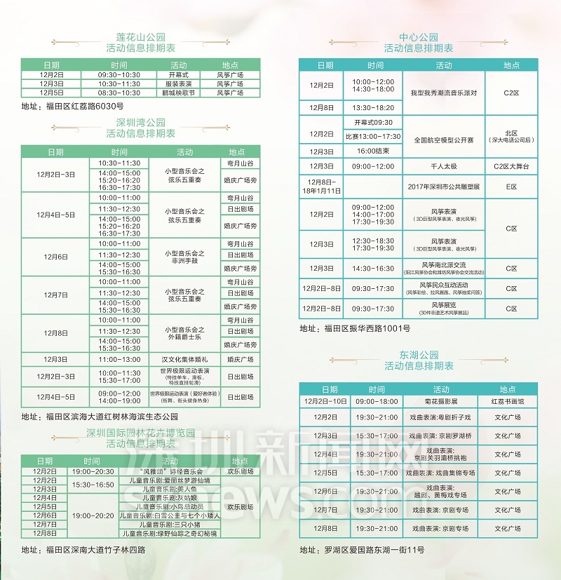 深圳新聞網(wǎng)12月1日訊(記者 鐘鴻冰 通訊員 崔嵩)一年一度的公園文化節(jié)即將到來(lái),12月2日-12月8日,2017年第十二屆公園文化周將在全市27家公園舉行。本屆公園文化周緊密結(jié)合創(chuàng)建“國(guó)家森林城市”和打造“世界著名花城”重點(diǎn)工作,以“美麗深圳 多彩生活”為主題,充分展現(xiàn)美麗宜居的城市環(huán)境及豐富多彩的城市文化生活。
