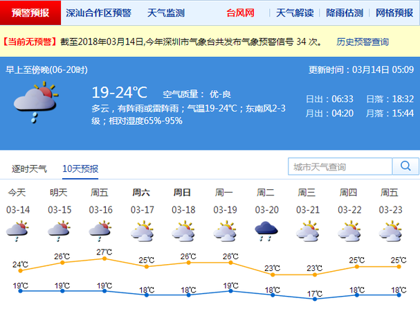 深圳新聞網(wǎng)3月14日訊(記者 何暢)深圳市氣象臺(tái)3月14日05:09發(fā)布,14-15日多云有陣雨或雷陣雨;16日陣雨轉(zhuǎn)多云,沿海有霧;17-18日多云;19日多云轉(zhuǎn)分散陣雨。