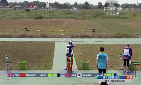 第十組比賽,張鑫秋與康金允前四靶都打中,第五靶張鑫秋率先出槍,打中,隨后出槍的康金允稍顯緊張,結果打失。這樣,張鑫秋以45靶破亞運會成績奪得冠軍,康金允獲得亞軍。