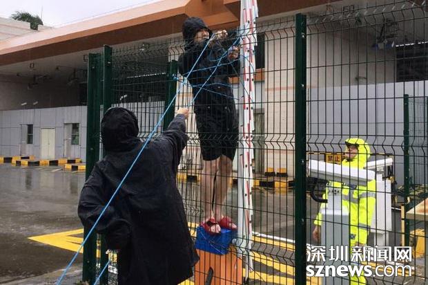 邊檢技術(shù)民警冒雨在搶修被強(qiáng)臺(tái)風(fēng)損毀的車道閘桿
