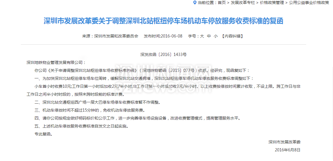 2016年深圳市發(fā)改委調(diào)整深圳北站停車收費政策
