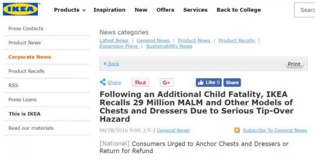 根據(jù)美國消費者產(chǎn)品安全委員會的數(shù)據(jù),宜家當時在全球召回了2300萬件該系列產(chǎn)品 -其中包括近300萬件在美國銷售的產(chǎn)品和110萬件在加拿大銷售的產(chǎn)品。