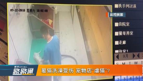 調(diào)取監(jiān)控后發(fā)現(xiàn),當時給貓吹毛的工作人員動作粗暴,在貓只抗拒躲閃的時候,有拖拽的動作,期間還把貓騰空甩起頭撞到墻上。