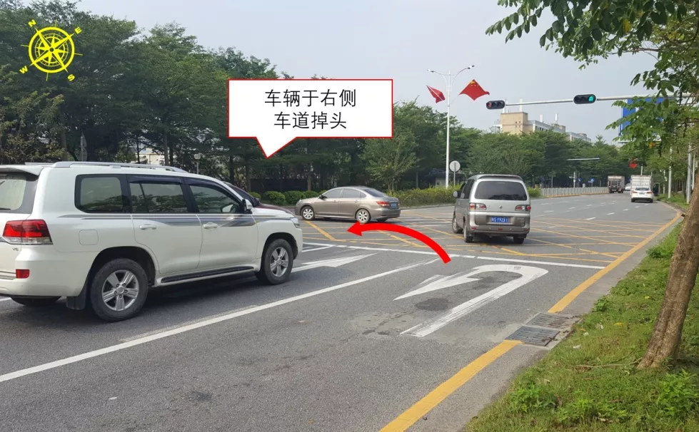 福鳳/騰豐三路口東側(cè)為鳳凰山旅游區(qū),通勤車流較多?,F(xiàn)狀路口未設(shè)置紅綠燈,人車交織嚴重,交通秩序混亂,易發(fā)交通事故。9月14日,深圳交警啟用福鳳/騰豐三路口信號燈。為解決掉頭車轉(zhuǎn)彎半徑不足問題,進一步在距路口約96米處開設(shè)掉頭口,并以最外側(cè)車道作為掉頭車道,同時與福鳳/騰豐三路口實施聯(lián)動設(shè)置燈控掉頭。該路口是寶安首個“一機兩控”+外側(cè)掉頭微創(chuàng)新路口。