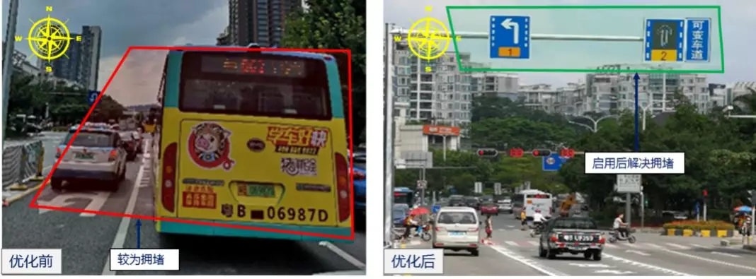 2.龍翔大道/吉祥路口啟用可變車道,相關(guān)路口平均周期減少約10秒 為解決龍翔大道/吉祥路口擁堵問題,深圳交警對龍翔大道/龍城大道、龍翔大道/建設(shè)、龍翔大道/吉祥、龍翔大道/如意等4個路口實施可變車道及燈控掉頭口綜合管控措施,緩解上述路口平峰與高峰之間存在的分時段排隊不均、掉頭車輛與過街行人交織隱患問題,優(yōu)化措施實施后,相關(guān)路口的平均周期減少約10秒。 龍翔大道/吉祥路口南進口可變車道運行情況點贊