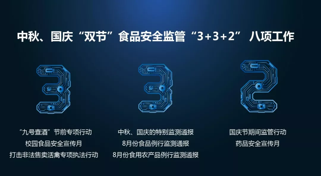 發(fā)布會(huì)對(duì)中秋、國(guó)慶“雙節(jié)”食品安全監(jiān)管“3+3+2”共八項(xiàng)工作進(jìn)行發(fā)布:
