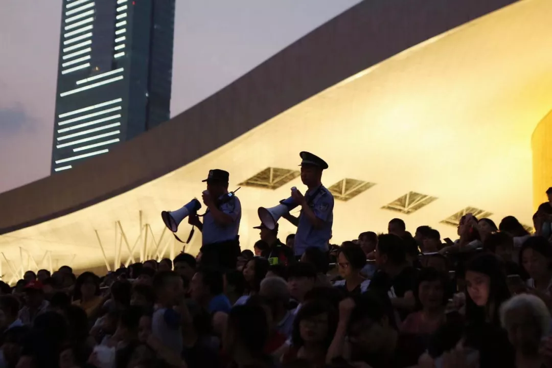燈光秀表演持續(xù)時間長,參加安保工作的警力從17點到23點的6個小時里,始終處于工作狀態(tài),由于人流量每天都近20萬人次,工作強度之大難以想象,但他們毫無怨言堅守崗位,一刻不停地穿梭于人群中,民警和隊員用人墻隔離出一條條通道,身挎大喇叭,全力疏散引導,維護現(xiàn)場秩序。在各個出入口、疏散通道、地鐵口、公交站臺等人流密集點都能看到他們忙碌的身影。