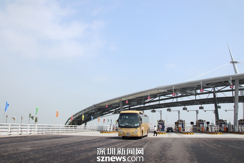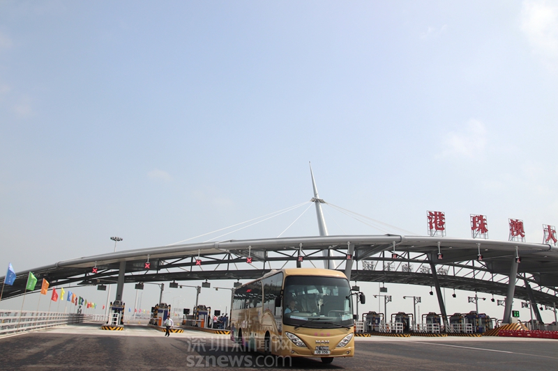 一輛穿梭巴士經(jīng)過(guò)港珠澳大橋珠海收費(fèi)站