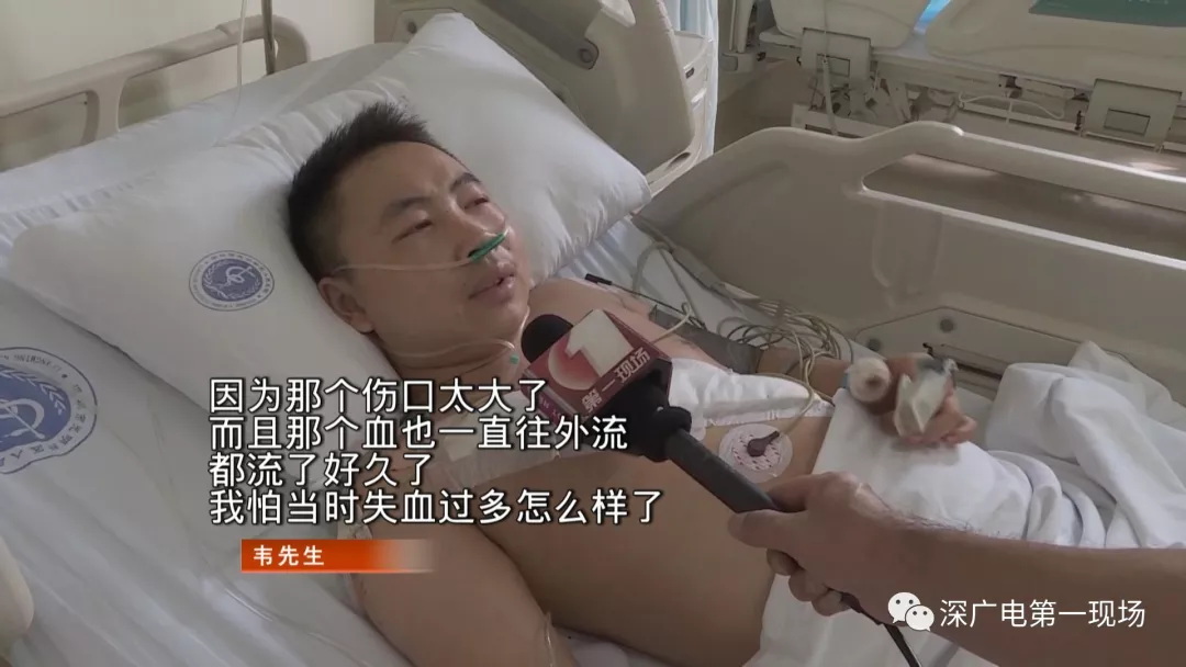 經(jīng)過急救,傷者韋先生已被轉(zhuǎn)往胸外科接受治療。韋先生說,昨天晚上因?yàn)榈秱朐旱目刹恢顾粋€(gè)人。