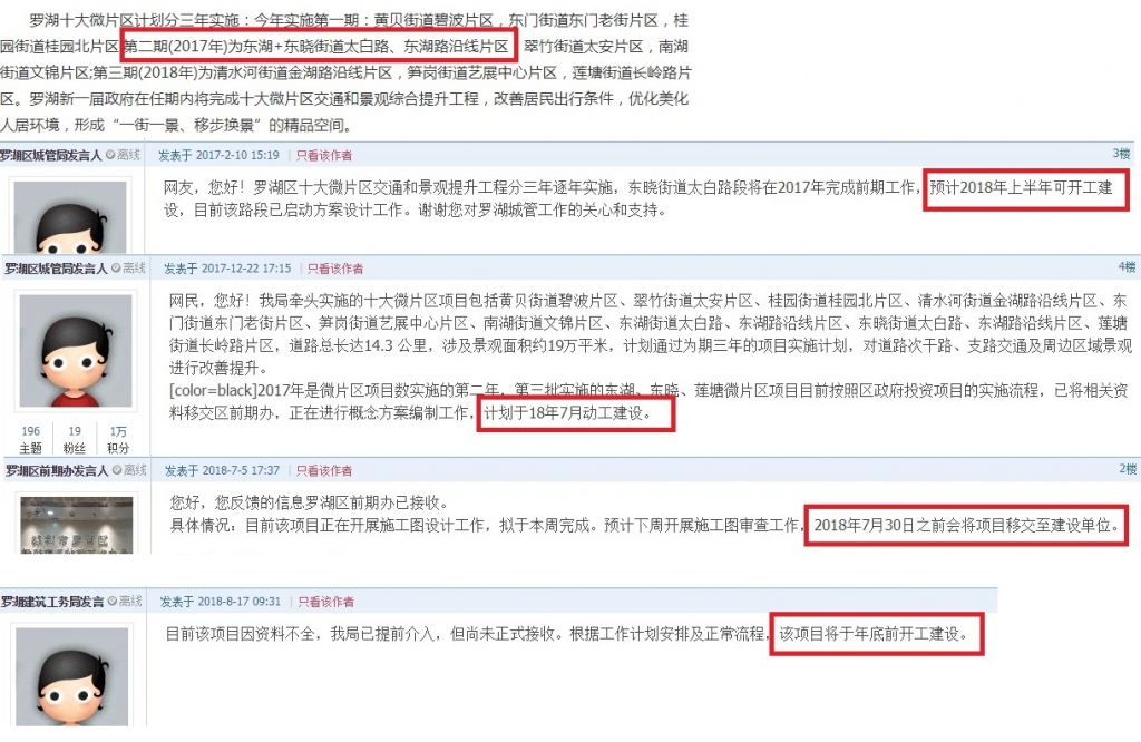 據(jù)了解,為改善居民出行條件,美化居住環(huán)境,羅湖區(qū)于2016年發(fā)布了十大微片區(qū)交通和景觀綜合提升工程計(jì)劃。該計(jì)劃表示全工程將分三年實(shí)施,而太白路-東湖路微片區(qū)屬第二期,應(yīng)于2017年開始動(dòng)工實(shí)施。但截至2018年11月,該項(xiàng)目仍未動(dòng)工。從網(wǎng)友發(fā)布的截圖上看,一個(gè)名為“羅湖區(qū)城管局發(fā)言人”的論壇賬號(hào)分別于2017年2月、12月以及2018年7月和8月對(duì)太白路-東湖路微片區(qū)景觀提升工程延遲實(shí)施的計(jì)劃進(jìn)行了回復(fù)。而相應(yīng)的動(dòng)工日期也從2018年上半年延遲到了2018年底。