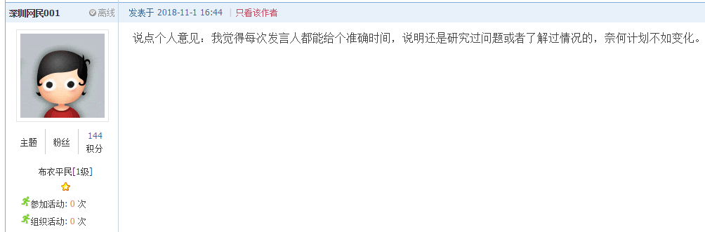 縱觀該帖文,網(wǎng)友將2017年以來的文字截圖一一呈現(xiàn),“有圖有真相”的質(zhì)疑羅湖區(qū)相關(guān)政府部門。但,就如上圖網(wǎng)友所言,不管面對(duì)何事,都應(yīng)當(dāng)讓“理解”先行。只是當(dāng)市民給予了一定理解之后,也希望相關(guān)部門信守承諾,盡量避免屢次爽約,畢竟政府部門的信用是靠其一言一 行來建立的。