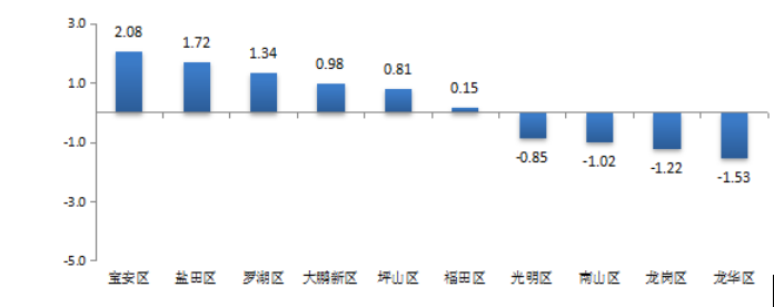 從各區(qū)(新區(qū))城市交通文明進步指數(shù)來看,福田區(qū)、羅湖區(qū)、鹽田區(qū)、寶安區(qū)、坪山區(qū)和大鵬新區(qū)均有所進步,其中寶安區(qū)進步最大,進步指數(shù)為2.08%,鹽田區(qū)次之,進步指數(shù)為1.72%;而南山區(qū)、龍崗區(qū)、光明區(qū)和龍華區(qū)則有所退步,其中龍華區(qū)和龍崗區(qū)退步較大,進步指數(shù)分別為-1.53%和-1.22%(見圖4)。