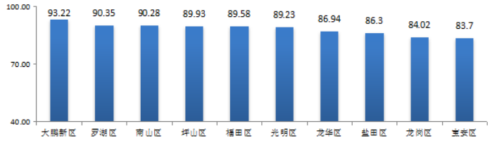 從各區(qū)(新區(qū))城市交通文明指數(shù)來看,大鵬新區(qū)得分最高,為93.22分,羅湖區(qū)和南山區(qū)得分均在90分以上,龍崗區(qū)和寶安區(qū)得分較低,分別為84.02分和83.70分,其他區(qū)得分在86.00-90.00分之間(見圖2)。